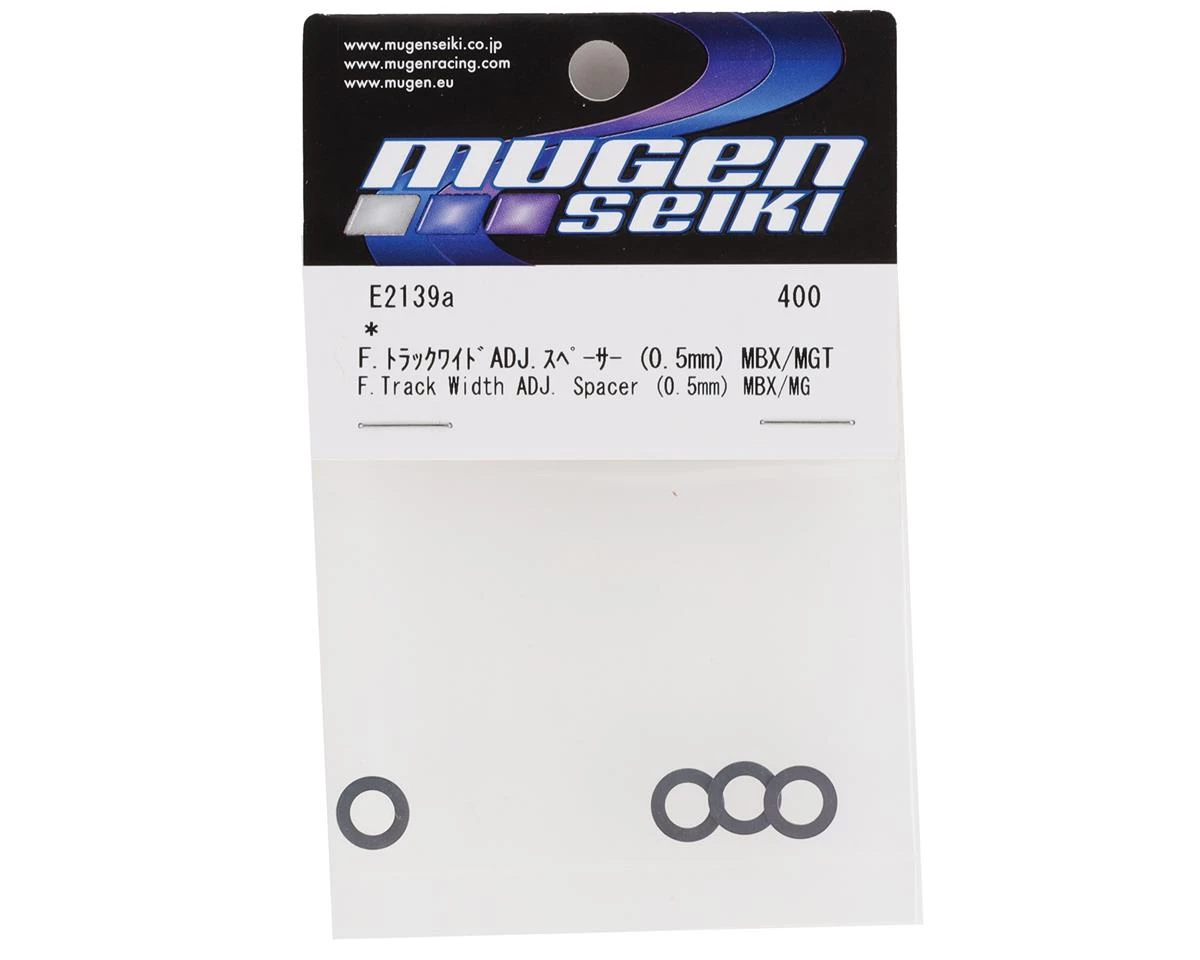 Mugen Seiki 0.5mm Aluminum Front Track Width Spacer. These optional spacers are designed to allow you to fine tune your front track width. Package includes four spacers intended for the Mugen Seiki MBX8R or the MBX8R ECO.