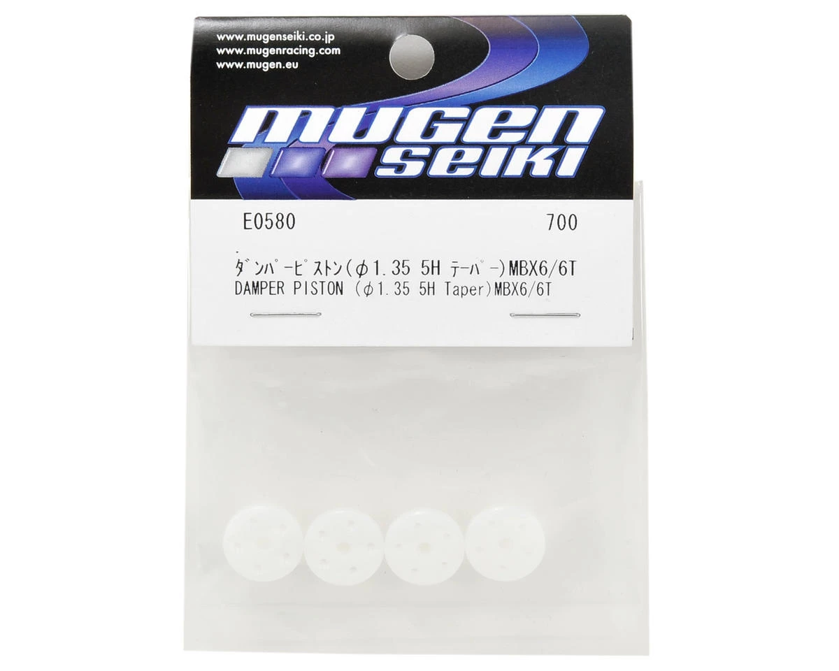 This is an optional Mugen 1.35mm Tapered 5-Hole Damper Piston Set, and is intended for use with the Mugen MBX6 family of vehicles. These pistons feature five tapered 1.35mm holes that provide you with another factory option that will make it easier to get your suspension dialed in to any track condition.