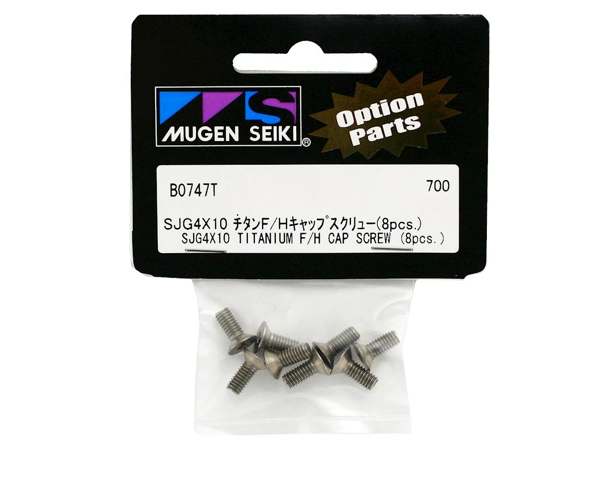 This is a pack of eight 4x10mm titanium flat head screws from Mugen Seiki. These screws are intended for use with Mugen vehicles, but are a excellent option to remove weight from other vehicles that use 4x10mm flat head screws.