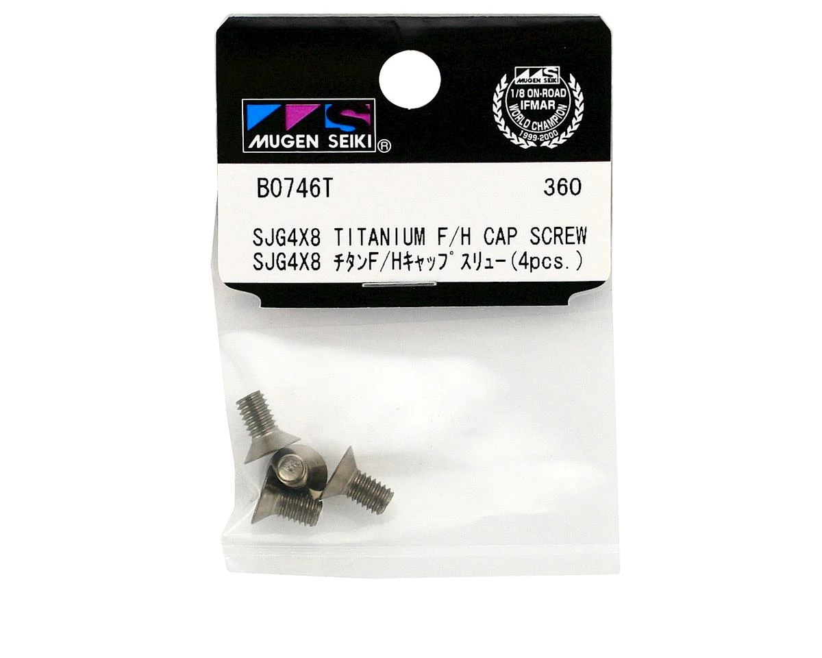 This is a pack of four 4x8mm titanium flat head screws from Mugen Seiki. These screws are intended for use with Mugen vehicles, but are a excellent option to remove weight from other vehicles that use 4x8mm flat head screws.
