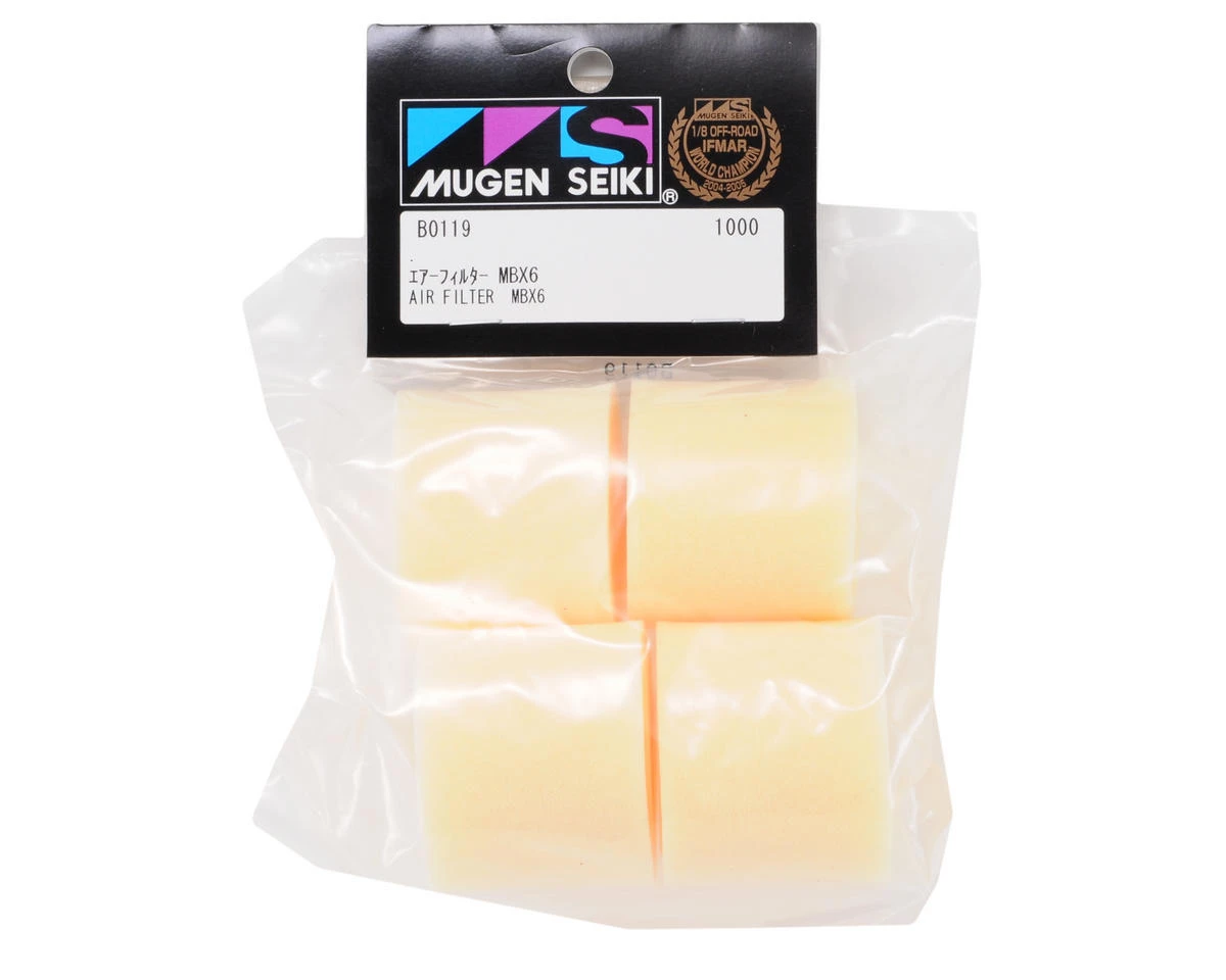 This is a set of four replacement Mugen Air Filter Foams, and are intended for use with the Mugen MBX6 1/8 Scale Buggy.