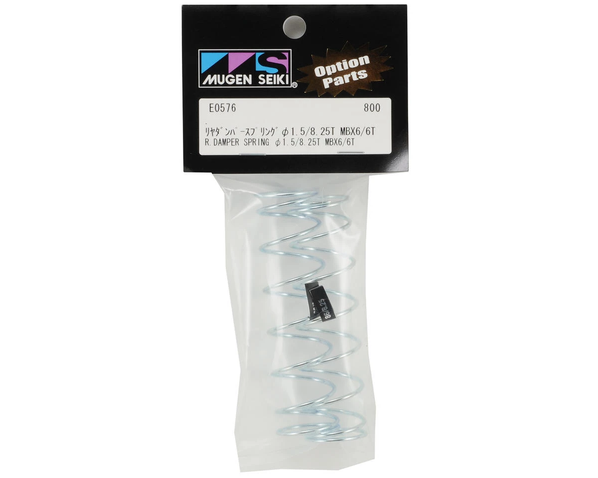 This is an optional Mugen Big Bore Rear Damper Spring Set, and is intended for use with the Mugen MBX6, MBX6T and MBX6-E. These springs are made with 1.5mm wire making them slightly lighter than the previous springs, and feature an improved coil design which will make both your buggy and truggy much more stable through bumps and jumps. These springs were used by the Mugen Factory Race Team at the 2010 IFMAR Off Road World Championships in Thailand.