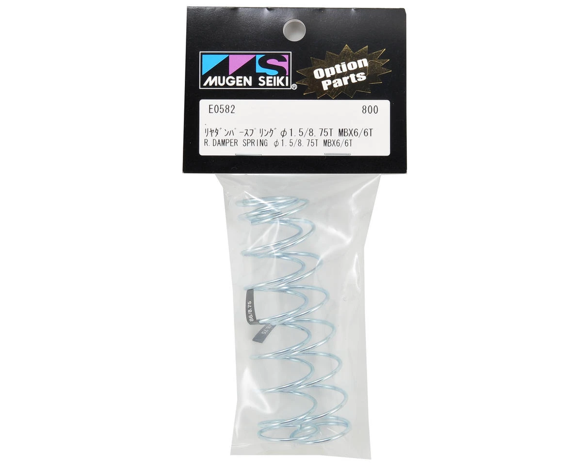 This is an optional Mugen Big Bore Rear Damper Spring Set, and is intended for use with the Mugen MBX6 family of vehicles. These springs are made with 1.5mm wire making them slightly lighter than the previous springs, and feature an improved coil design which will make both your buggy and truggy much more stable through bumps and jumps. With the addition of the Soft rear springs to the Mugen “1.5 wire” spring selection, setting up the shocks on your buggy or truggy has now become much easier.