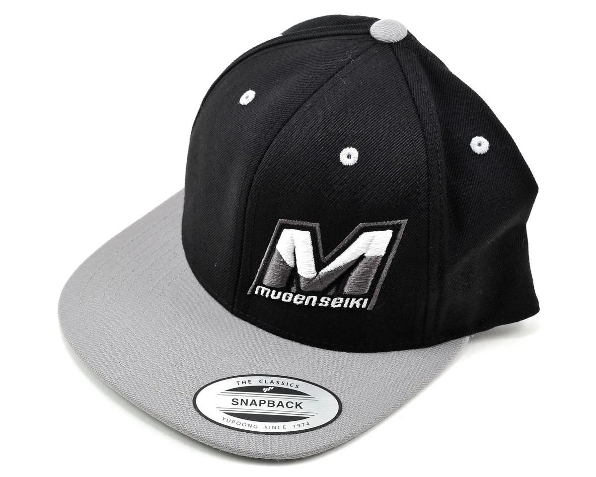 This is the Mugen “M” Logo Black Flat Bill Hat. This hat features the Mugen Seiki “M” graphic embroidered on the right front panel, and a gray flat bill. The snapback design provides a good fit on a variety of head sizes.Â
