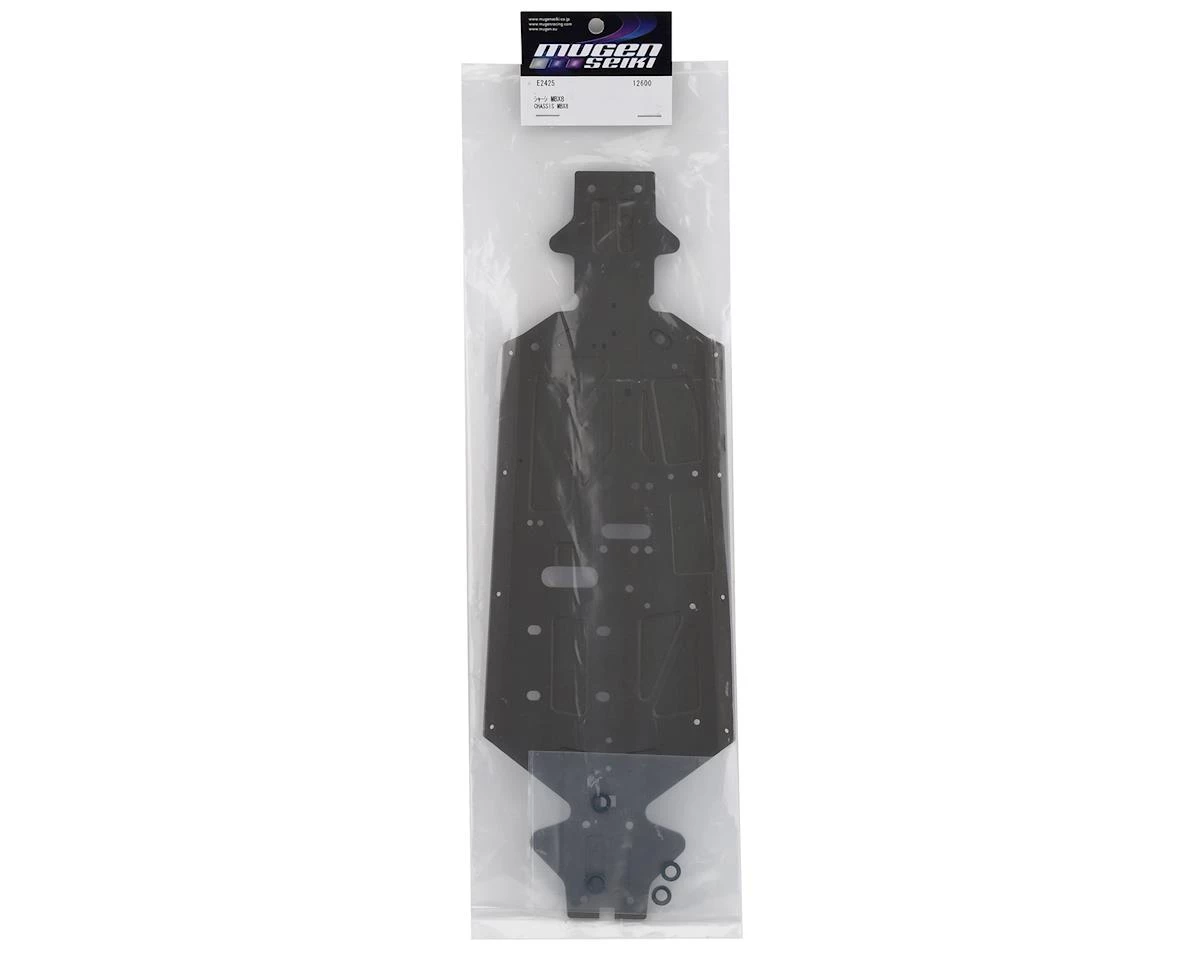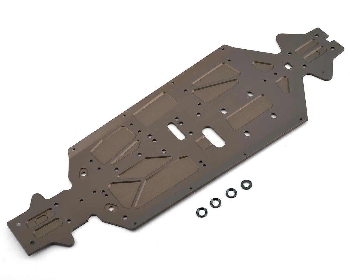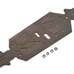 This is the revised Mugen Aluminum Chassis for use with the MBX8 1/8 Nitro Buggy. This chassis has modified the shape of the part where the MUGE2712 engine mount washers rest, so the SJG 4x10mm screws can be made flat with the chassis.