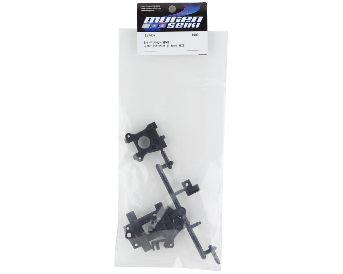 Mugen Seiki MBX8/MBX8T Center Differential Mount. This replacement center differential mount is intended for the Mugen Seiki MBX8, MBX8R, MBX8 ECO, MBX8T or MBX8T ECO. Package includes one replacement center differential mount set.