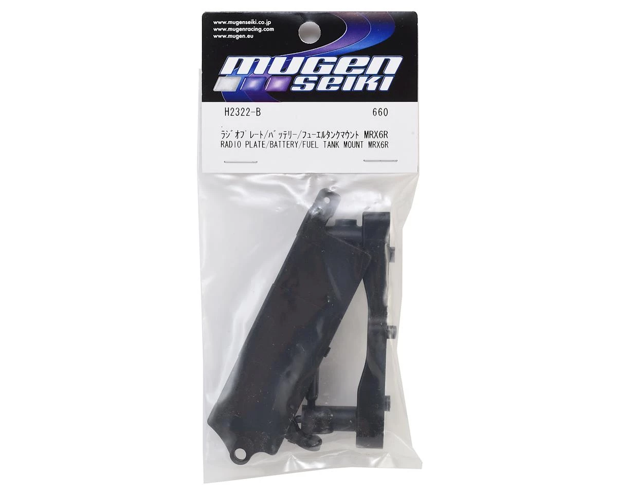 Mugen MRX6R Radio Plate & Battery/Fuel Tank Mount. Package includes replacement plastic radio plate and fuel tank mount components.Â