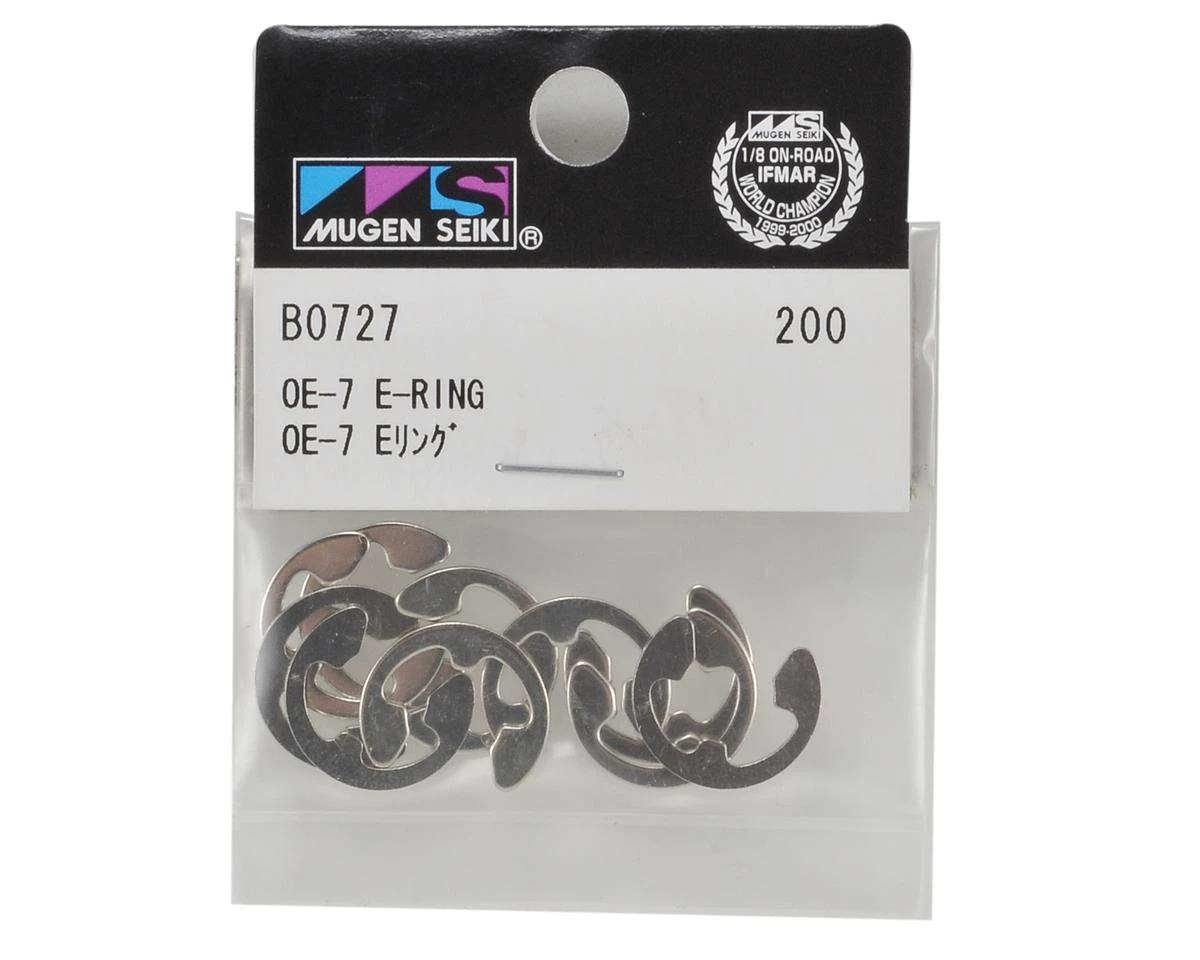 This is a replacement Mugen OE-7 E-Ring Set, and is intended for use with the Mugen MRX5. These are used to secure the pulleys and gears to the gear shafts in various locations.