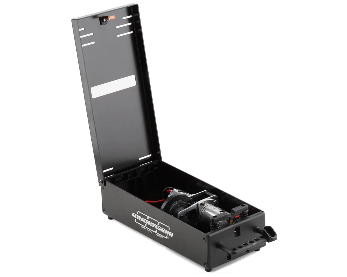 Mugen Seiki Pro Starter RIII On Road Starter Box. This starter box is built using a high-quality aluminum housing to allow a full range of LiPo batteries. The rear handle features a convenient place to hold the glow starter without interfering with the back of the vehicle. Fully adjustable locating pins allow this box to be compatible with most off-road vehicles, and the rubber feet help to keep the box stable while a vehicle is on it. Package includes one starter box.