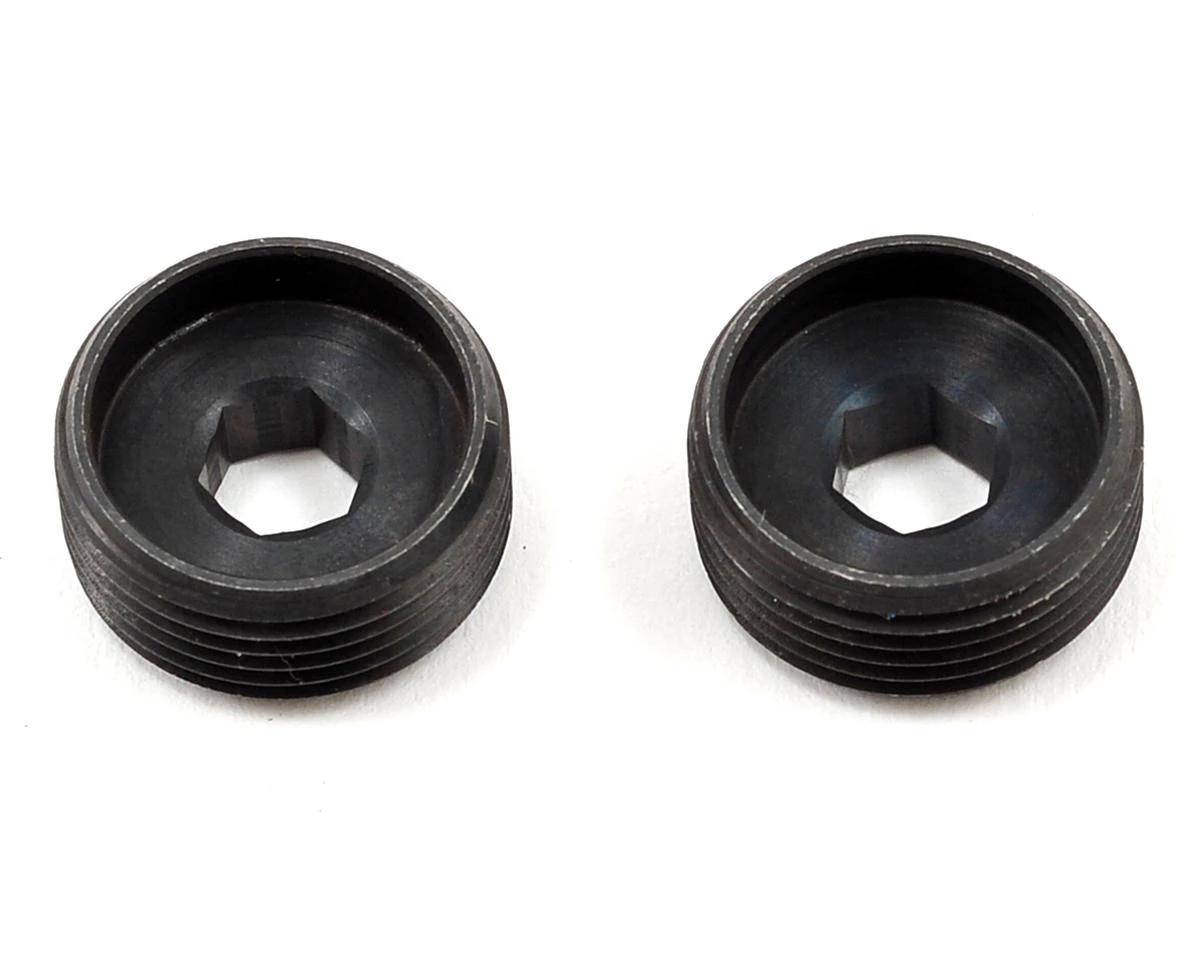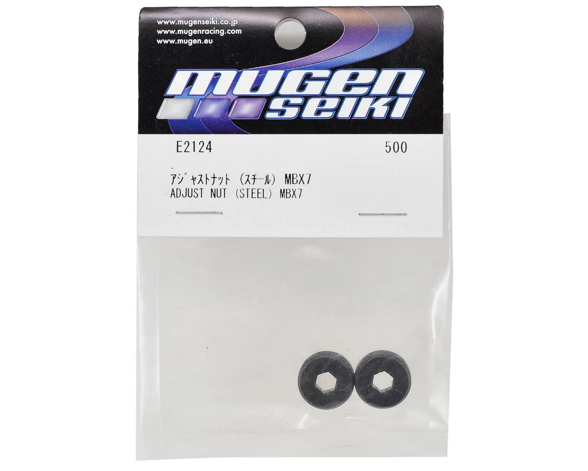 This is a pack of two optional Mugen Steel Kingpin Ball Adjusting Nuts. These nuts are heavier than the stock parts, and eliminate the need for arm weights. They will help to improve the steering and handling in bumpy and low traction conditions. When all four adjusting nuts are replaced, these will add 13.8 grams of weight to the front suspension.